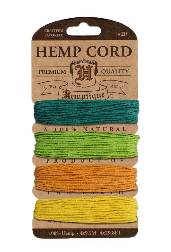 100% Hemp Thickness: approx. 1 mm thickness Polished Hemp Length: Approx. 29.8ft x 4 (9.1m x 4) Eco-Friendly, Biodegradable, AZO-Free Dye, Oil-Free Perfect for Macrame Jewelry Making, Scrapbooking, Greeting Cards, Gift Wrapping, Friendship Bracelets, Crochet, etc. Each card comes with 4 coordinated colors of hemp cord that are approximately 29 feet each. These Hemp Cord Cards are perfect for any small to medium crafting project. Hemptique’s hemp cord is polished to eliminate stray fibers, maintain strand consistency, and enhance the brilliant colors of the product. Hemptique's Eco-Friendly and multipurpose Hemp Cord can be used in many exciting ways. These cards have been curated with fun colors and amazing color palettes.