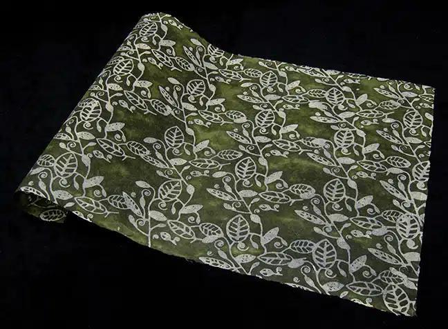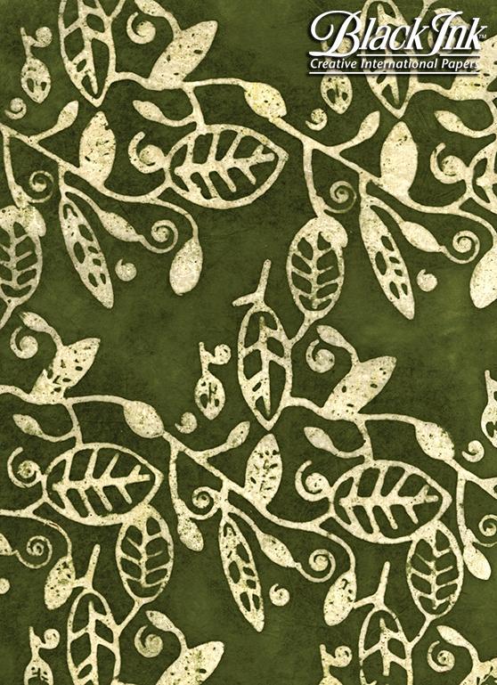 Featuring a scrolling batik print of leaves & vines, this pattern is printed on a handmade lokta paper using a combination of heated waxes applied as a “resist” pattern, resisting the color wherever the wax has been applied.  Mottled tones of olive green are the perfect contrast to the natural colored pattern created by the wax resist.