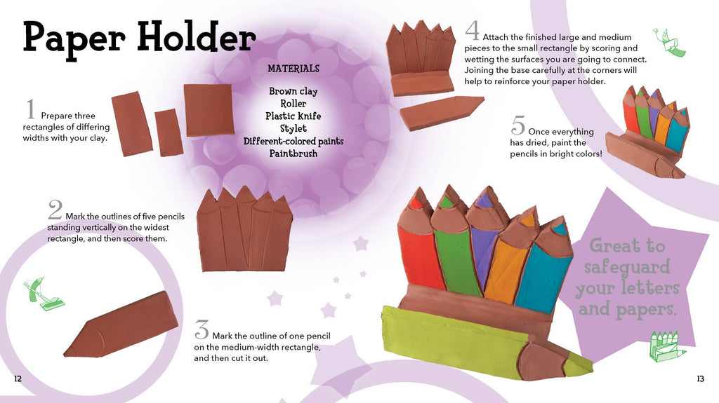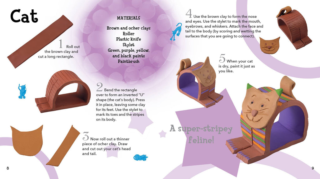 Find out how easy it is to make a wide range of clay objects using only the most commonly available materials and simplest techniques—no baking required! In 5 easy steps, children can make the air-dry clay models. These whimsical designs allow kids to get their hands messy modeling clay immediately, with rewarding results. Sculpt balls of colored clay into a friendly Martian, a funny cow, a jewel-like necklace, a pear jar, and other unusual objects. For children five years and older. 32 pp | 95 color illustrations