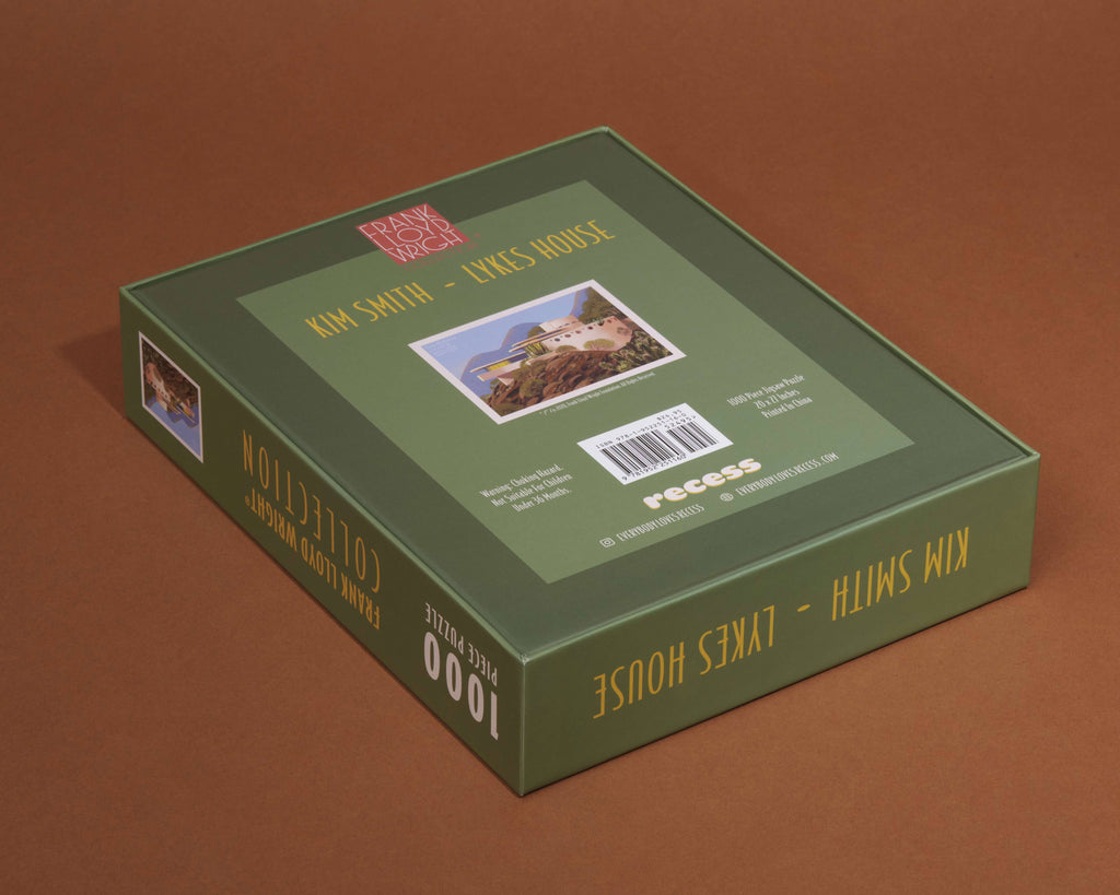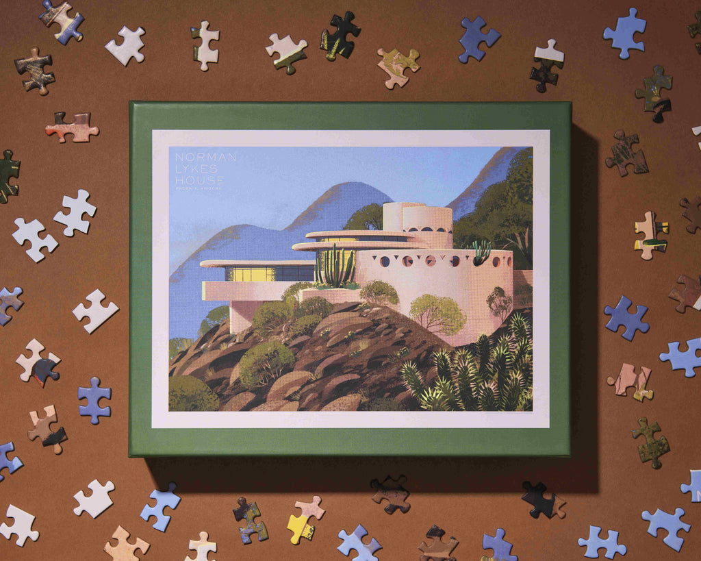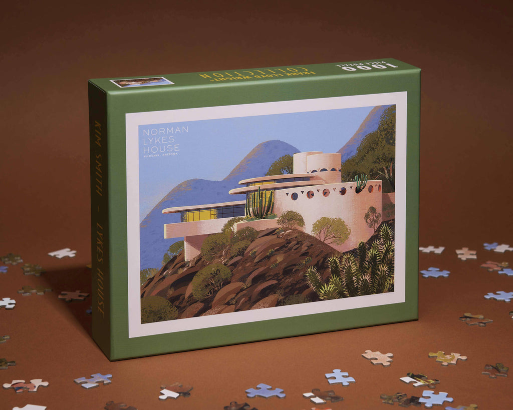 The Frank Lloyd Wright Foundation and Recess Puzzles are pleased to present a new 1000 piece jigsaw puzzle featuring original artwork by award-winning illustrator Kim Smith. This beautifully illustrated puzzle is a great family activity for adults and kids alike. High quality puzzle pieces come packaged in a sturdy and easy-to-wrap box, perfect for gifting, reuse, and storage. Completed puzzle: 28" x 21" 1000 pieces * The Norman Lykes House is located in Phoenix, Arizona