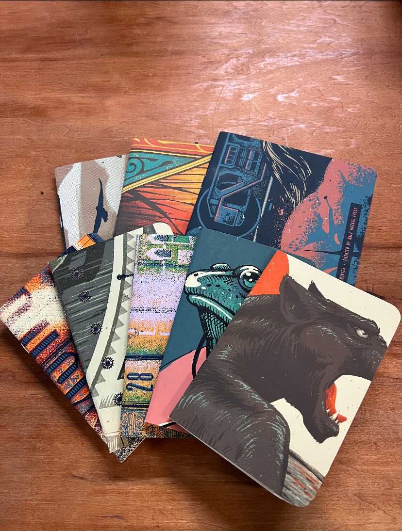We like to be as responsible as possible with our waste. So we came up with these perfect, Pocket-Sized Jotter Books that are up-cycled from our test prints & run misprints. Why throw them in the trash when you can throw it in your pocket instead? All covers are randomly chosen and cut out during assembly so no book is exactly like the other, making each one it's own unique piece of art. * 4" W x 6" H // Selected, Cut & Assembled by Hand * 100lb. Multi-Color, Up-cycled Test Print Poster Cover * 20 Pages // 70lb. Acid-Free Speckletone Blank Pages * All Jotter Books Will Be Selected at Random Requests for bulk orders or wholesale ordering of this item can be sent to info@halfhazardpress.com