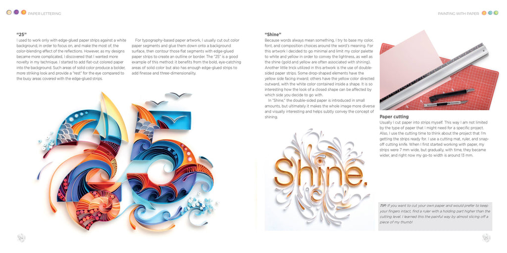 The vibrant three-dimensional paper artworks in this book will stop paper art fans of all levels in their tracks. After the initial amazement, enjoy trying this method yourself, expanding your skills at your own pace with highly regarded artist Yulia Brodskaya's guidance. Using two simple materials—paper and glue—she's perfected the placement of carefully cut and bent strips of paper to "paint" images. Brodskaya offers not a predictable project book, but instead practical tips on how to work with her method in various ways of your own. See how this method gives new impact to lettering, nature themes, portraits, larger pieces, and experiments. Learn how to choose colors, the importance of testing compositions, which part of the image to start with, and when to consider it complete. 176 pp | 150+ color photos